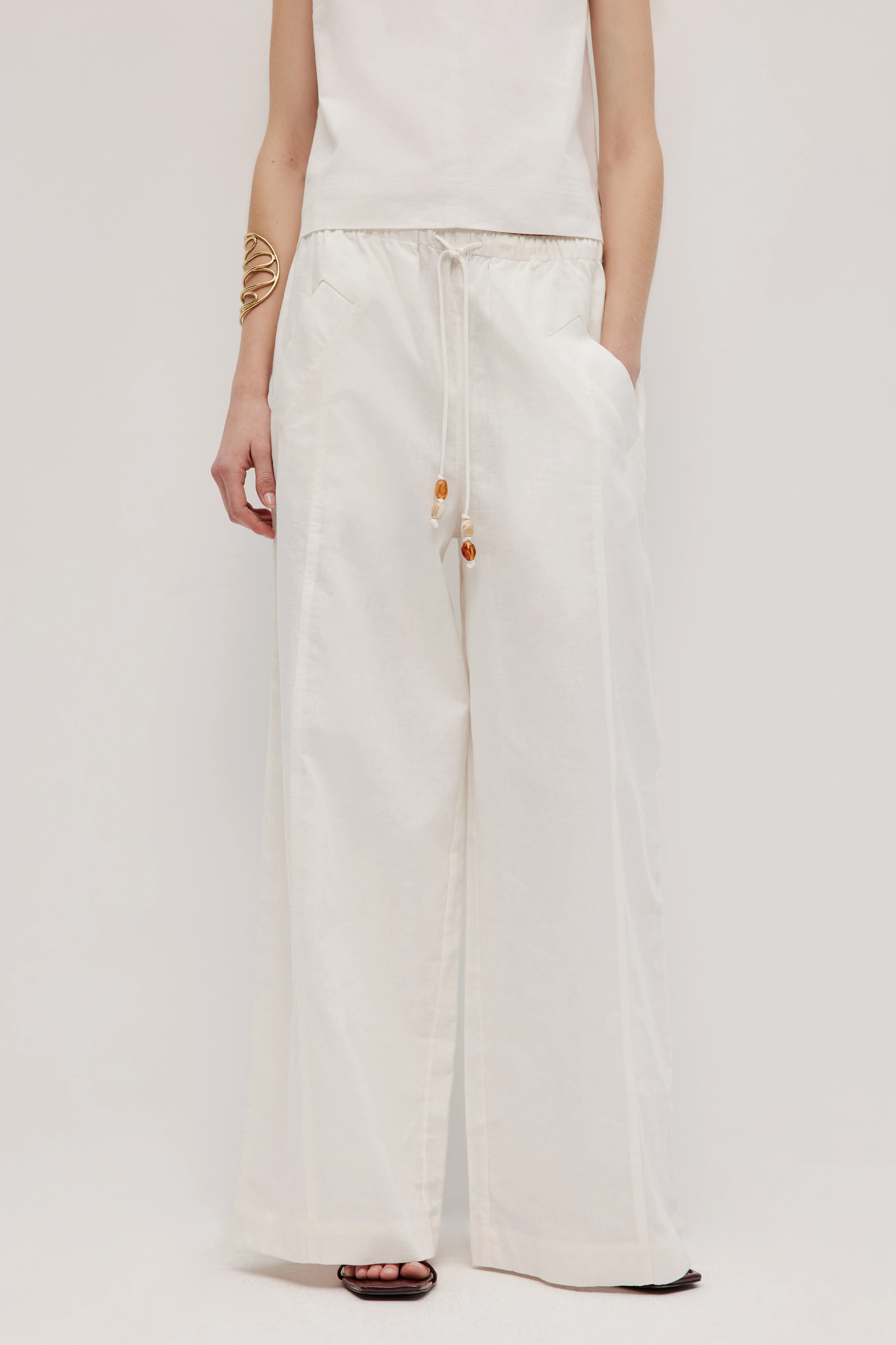 - Elastic waist with rouleau drawcord and resin bead detail
